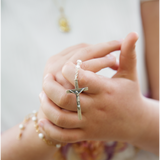 - Diseños y estilos: Piezas con detalles religiosos, perlas, corazones o formas clásicas, ideales para complementar el atuendo de comunión.